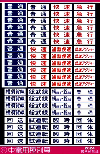 鋼製近郊形電車用の前面種別幕。反転紺色の普通幕が象徴的な、側面電動幕と版下を同じくするフィルム幕です。 1972年の113系1000'番代あたりを起源とすると思われ、以降の東海顔にはこの幕が標準装備となった感がありました。反転幕の普通はわずかな書体 の違いで2タイプを収録。オレンジ色の快速や愛称名入りのコマは民営化後のデザイン。他、静岡区T編成用の文字が小さい普通も。 |
